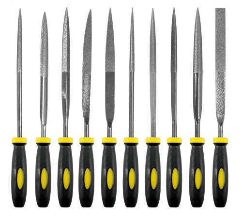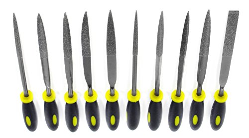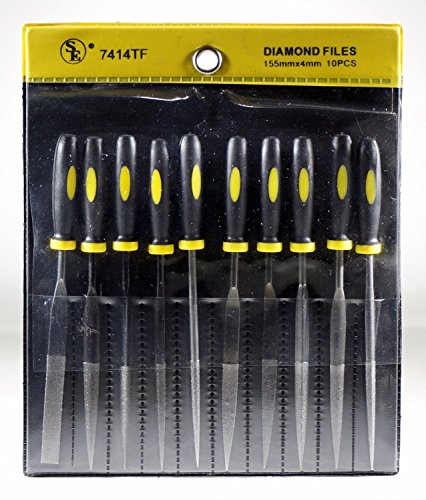 SE is very excited to present this 10-Piece Black Titanium Diamond File Set. This is an extremely valuable file set due to the titanium alloy, coated with diamond dust?a perfect combination for toughness and durability. Our 10-Piece Diamond File Set includes the following shapes: Round Half Round Three Square Knife Barrette Triangle Crossing Equaling All of these files have a grit rating of 150. The handles are rubberized to allow for greater comfort and control with chiseling on your craft or project. The two most useful properties of titanium are corrosion resistance and its extremely high strength-to-density ratio, which is why SE has crafted these chisels with such strong and resistant material. The coated diamond dust is another layer of quality as it creates thousands of cutting surfaces when you apply the chisel to a softer material’s surface. A chisel is a tool with a specific, characteristically shaped cutting edge on its end, for carving or cutting a semi-hard material such as wood, stone or metal either by hand, striking it with a mallet, or using another external power. If you are someone who routinely works with chisels, then this set is a must-need to add to your tool box. With a roll-up pouch, these files are easy to store and transport. SE products are quality items for extremely reasonable prices. SE is committed to providing the customer with the best source for value possible on the market. You will enjoy the quality, function and usefulness this 10-Piece Black Titanium Diamond File Set has to offer.