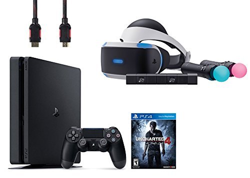 Includes: VR headset, Processor unit, VR headset connection cable, HDMI cable, USB cable, Stereo headphones, AC power cord, AC adaptor, PlayStation VR Demo Disc, PlayStation Camera, 2 PlayStation Move motion controllers, and PlayStation 4 Slim 500GB Console - Uncharted 4
