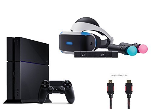 Includes: VR headset, Processor unit, VR headset connection cable, HDMI cable, USB cable, Stereo headphones, AC power cord, AC adaptor, PlayStation VR Demo Disc, PlayStation Camera, 2 PlayStation Move motion controllers, and PlayStation4