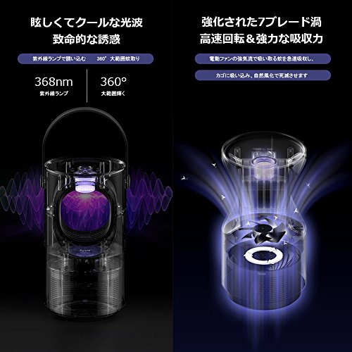 - ❤【薬剤不使用&安心安全】✔高電圧で虫を退治する殺虫ライトや殺虫剤を気化させる蚊とり機器と違い、物理的な方法で、毒素、煙、臭いや放射線などは全然ありません。嫌な匂いも出ないので、小さなお子様やペットがいるご家庭でも安心使用できる新世代蚊とり器です。 ✔UV光源誘引式蚊取り器として、虫が好む波長(365-375nm)の光を点灯させ、20~40メートル範囲内の蚊などを誘引し風化死滅して、殺虫効果が抜群です。
