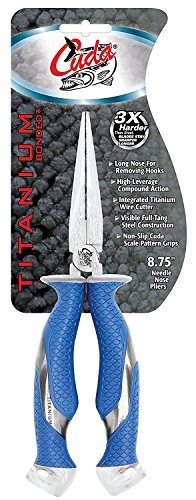 Visible full-tang steel construction for increased durability. Titanium bonded blades stay sharper longer. Integrated Titanium wire and mono cutter. Visible full-tang steel construction. Non-slip Cuda scale pattern grips. These Cuda 8.75" Needle Nose Pliers feature High-Carbon Titanium Bonded jaws and high-leverage compound action. The full tang steel construction is visible through the Cuda scale pattern, non-slip handle grips. Also features an integrated wire and mono cutter.