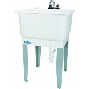 One piece molded construction, using Mustee's Co-Polypure resin, 20 Gallon capacity, extra deep 13" tub with smooth surface, Accommodates dual-handle faucet with 4" center
