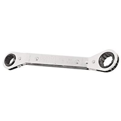 The wrench self-aligns with the fastener.. FEATURES:• Full polish finish provides corrosion resistance and easy to clean surfaces. • 25° offset box end helps keep shank clear of obstructions. • Shorter length for access to confined workspaces. • Reversing switch lever allows for easy changes in turning direction which helps improve speed. • 12 point box end allows for fine indexing. • Fits 4, 6 and 12 point fasteners.