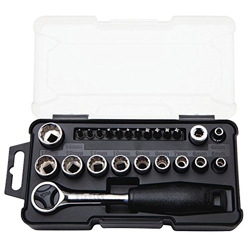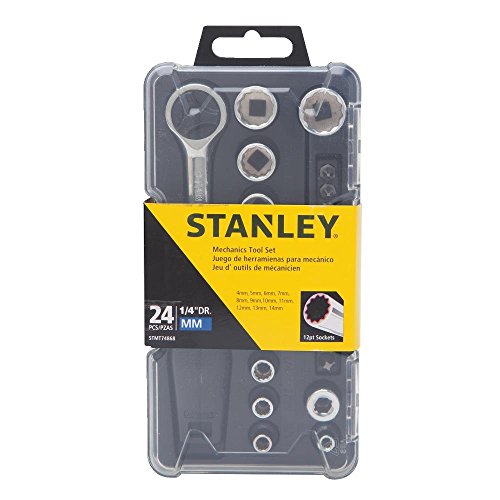 Backed by a limited lifetime warranty. The STANLEY STMT74868 24 pc 1/4" Metric Mechanics Tool Set offers a 54 tooth round head ratchet, and features 12 point sockets for added fit and torque. These sockets are designed with a chrome vanadium forged body. Full polished finish. These tools all meet or exceed ANSI specs. Set includes: 1/4" Drive Round Head Ratchet, 1/4" Drive Bit Adapter, 11 1/4" Drive 12pt Sockets - 4mm, 5mm, 6mm, 7mm, 8mm, 9mm, 10mm, 11mm, 12mm, 13mm, 14mm, 11 Specialty Bits.