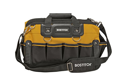 The BOSTITCH BTST516155 16" Open Mouth Tool Bag is constructed with 600x600 denier polyester fabric that protects the bag from wear and tear. This bag has a rigid, water-proof plastic bottom keeps tools dry and protected from wet surfaces. It features multiple pockets, compartments and loops for easy and convenient organization. A reinforced handle area enables durability, even with extra heavy loads, and it has large rubber-pull zippers for user ease.