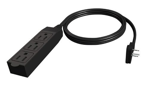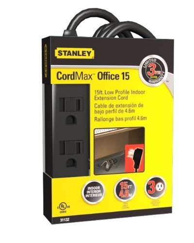 Product Description The Stanley CordMax Office is 15 ft in length. It has 3 grounded outlets. Its flat plug design allows furniture to sit closer to the wall. Rated:125V/13A/1625W. From the Manufacturer This Stanley 15 feet black heavy duty indoor extension cord comes with a low profile right angle plug. The sturdy PVC connector withstands harsh usage and has individual safety covers.