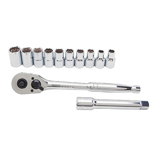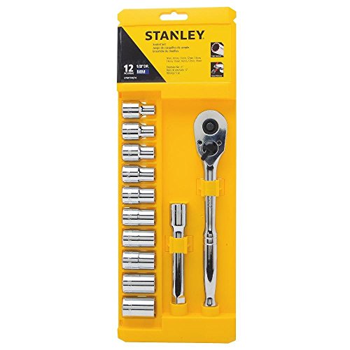The STANLEY STMT74874 12pc 1/2' MM Mechanics Tool Set offers a 54 tooth pear head ratchet, and features 12 point sockets for added fit and torque. These sockets are designed with a chrome vanadium forged body. Full polished finish. These tools all meet or exceed ANSI specs. Set includes: 1/2' Drive Pear Head Ratchet, 1/2' Drive 5' Extension Bar, 1/2' Drive 12 Point Sockets - 9mm, 10mm, 11mm, 12mm, 13mm, 14mm, 15mm, 16mm, 17mm, 19mm.
