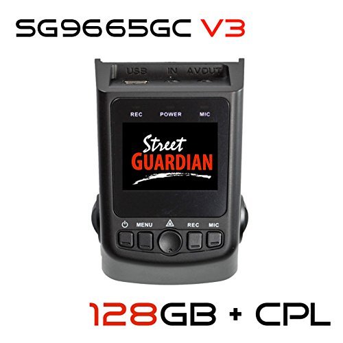 Street Guardian SG9665GC v3 2017 ? ?Street Guardian 1080p30 DVR ? ?Processor: Novatek NT96655 ? ?Updated 2017 Lens: f/2.0, 7 Element, Metal chassis, Glass lens, Dual IR cut, 120° horizontal viewing angle ? ?CPL Now Included ? ?CMOS sensor: Sony Exmor IMX322 ? ?Video resolution: Full HD 1080P at 30fps @ 15Mbit/sec ? ?Video format: H.264 compression, MOV format ? ?LCD display: 1.5-inch HD TFT screen ? ?Microphone: Built-in, on/off menu selectable ? ?Speaker: Built in ? ?Storage media: 128GB MicroSD card INCLUDED, Minimum 32GB Class10 recommended, 256GB maximum* ? ?Gapless recording: Supported with 1 second overlap ? ?Recording cycle: Menu selectable 1 min/3 min/5 min ? ?Date stamped video: Supported ? ?User selectable speed display: Supported ? ?Custom user text: Supported ? ?Motion detection: Supported ? ?Soft shutdown: Supported, last file save and soft shutdown ? ?Screen saver: Supported, menu selectable 3 minutes, 1 minute, off ? ?Night mode: Wide dynamic range (WDR) ? ?Built-in G-sensor: Yes, with adjustable sensitivity ? ?Incident file protect: Automatic by G-Sensor/Manual emergency by one touch button ? ?GPS: Included (external) ? ?Exposure compensation: Menu selectable -2.0 to 2.0 ? ?White balance: Auto ? ?Language: English/Spanish/Russian/Portuguese/German/Italian/Japanese/French/Simplified Chinese/Traditional Chinese ? ?Input mode: mini USB 5-pin port and DC 5V ? ?Power supply: Fail-safe Super Capacitor ? ?RTC: (Real Time Clock) Supported ? ?Dimensions/weight (LxWxH): 72 x 52 x 43mm(excluding the bracket) ? ?Unit Net Weight: 76g