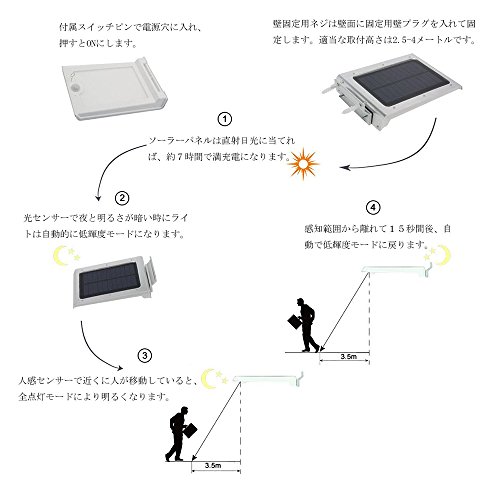 - 本製品はソーラーパネルで充電、AC電源は要りません、取付も便利です。本当に省エネかつ環境に優しい防犯、照明用センサーライトです。