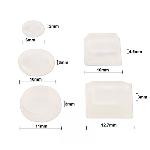 - 3個のシェイプ:台形、円柱状、半球形の; 5種類のサイズ: 60個11 mm x 3 mm、円柱形状、50個6 mm x 2 mm半球形の形状、50個10 mm x 3 mm半球形の形状、25個10 mmx10mmx4.5 mm台形形状、20ピース12.7 mmx12.7mmx3 mm台形形状;材質:ラバー