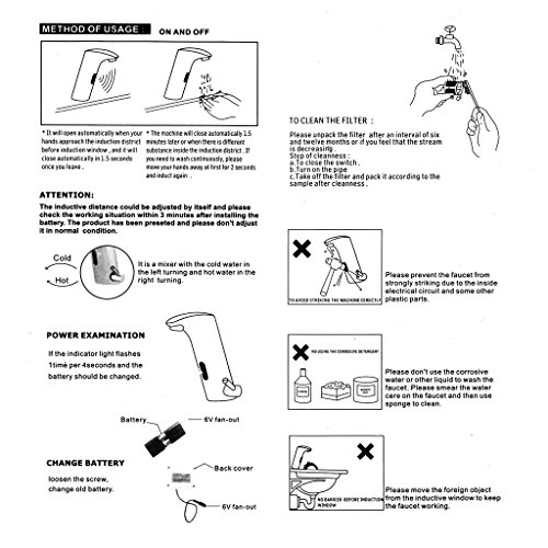- 赤外線センサーの蛇口は、手が誘導地区に近づくと自動的にオンになり、手を離すと自動的に1.5秒後に消灯します。