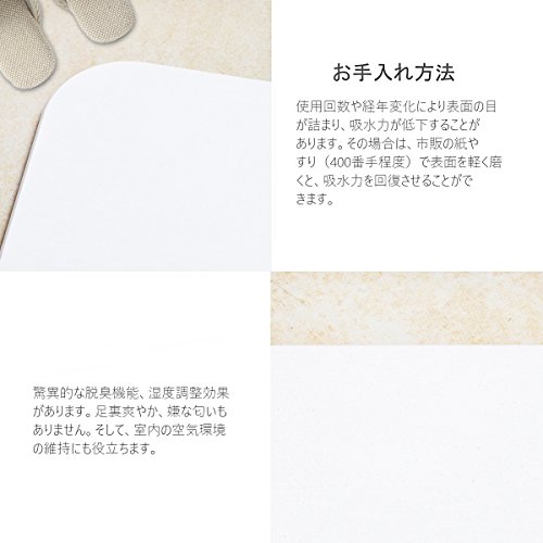 - 【天然素材】珪藻土とは、太古の植物性プランクトン(珪藻)が、永い年月をかけて海底や湖底に推積して化石化した天然の鉱物です。驚異的な脱臭機能、湿度調整効果があります。足裏爽やか、嫌な匂いもありません。そして、室内の空気環境の維持にも役立ちます。