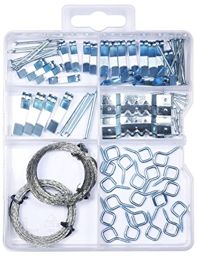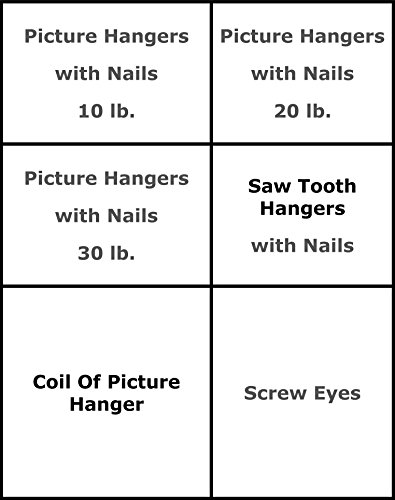- Include Screw eyes (18), Coil of picture wire (2), Saw tooth hangers (8), Small Picture hooks(8), Medium picture hooks (10), Large Picture hooks(4), picture-hanging nails(20).