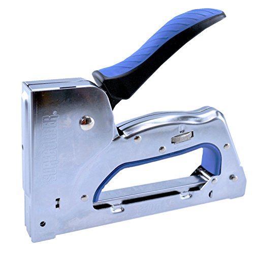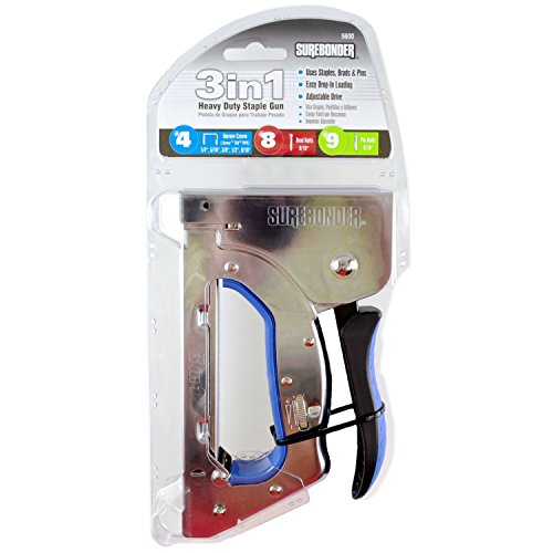 Easy drop in loading. Heavy duty all-steel construction. Non slip grip. Uses 1/4-inch through 9/16-inch staples, 9/16-inch Brad Nails or 9/16-inch Pin Nails. A heavy duty 3-in-1 staple gun. Heavy duty all steel construction drives narrow crown staples, brads and pin nails. Easy drop in loading. Features adjustable drive depth, durable chrome finish, ergonomic non-slip grip. Now you have one stapler for all your staple needs. Uses 1/4 Inch through 9/16 Inch staples (Surebonder No. 4 staples or Arrows T50 heavy duty staples). Also uses 9/16 Inch Brad Nails (Surebonder No. 8) and 9/16-Inch Pin Nails (Surebonder No. 9) pin nails.