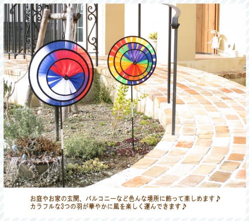 風に乗ってクルクル回るカラフルで可愛いウインドスピナー。玄関先やお庭、バルコニーなどいろんな場所で飾って楽しめます。レインボーカラーのカラフルな3連の風車が明るく楽しい雰囲気で風を運んできてくれます。飾り方は土に差し込んだり、ベランダや柱などに縛り付け固定して飾っても◎お家での使用以外にもキャンプの際のテントに飾って目印代わりとしてもご使用いただけます。 すずめやハト、カラスなど、鳥や虫よけにもオススメです。風車の生地は熱気球やパラシュートにも使用されるポリエステル製で紫外線の色褪せにも強く、雨、風にさらしてもOK!十分な耐久性を得られる特殊コーティング加工を施してあります。 軸(支柱)はグラスファイバー素材で軽くて風にも強い特性をもっています。お子さまから大人まで楽しめるウインドスピナーです。