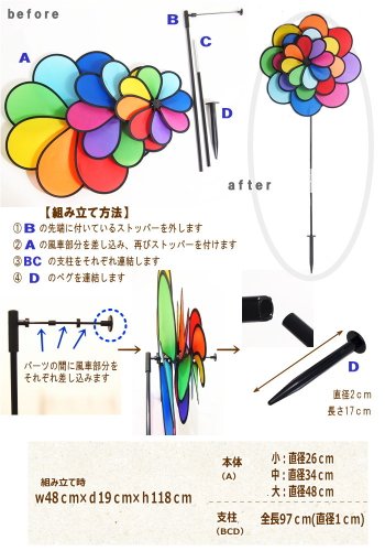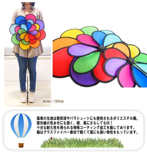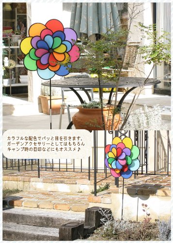 風に乗ってクルクル回るカラフルで可愛いウインドスピナー。玄関先やお庭、バルコニーなどいろんな場所で飾って楽しめます。レインボーカラーのカラフルな3連のお花の風車が明るく楽しい雰囲気で風を運んできてくれます。 飾り方は土に差し込んだり、ベランダや柱などに縛り付け固定して飾っても◎ お家での使用以外にもキャンプの際のテントに飾って目印代わりとしてもご使用いただけます。すずめやハト、カラスなど、鳥や虫よけにもオススメです。 風車の生地は熱気球やパラシュートにも使用されるポリエステル製で紫外線の色褪せにも強く、雨、風にさらしてもOK!十分な耐久性を得られる特殊コーティング加工を施してあります。軸(支柱)はグラスファイバー素材で軽くて風にも強い特性をもっています。お子さまから大人まで楽しめるウインドスピナーです。