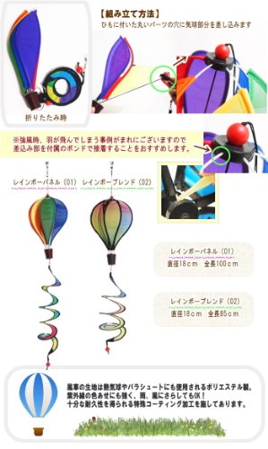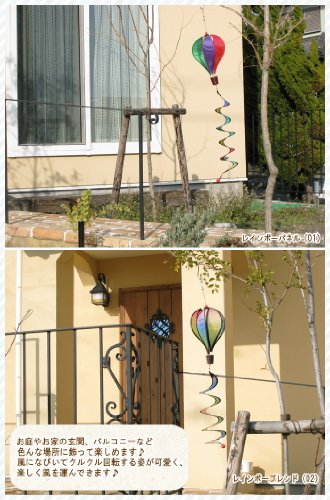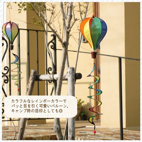 風に乗ってクルクル回るカラフルで可愛いウインドスピナー。玄関先やお庭、バルコニーなどいろんな場所で飾って楽しめます。 カラフルな、気球モチーフとらせん状の飾りが明るい雰囲気で楽しく風を感じる事ができます。お家での使用以外にもキャンプの際のテントに飾って目印代わりとしてもご使用いただけます。すずめやハト、カラスなど、鳥や虫よけにもオススメです。 風車の生地は熱気球やパラシュートにも使用されるポリエステル製で紫外線の色褪せにも強く、雨、風にさらしてもOK!十分な耐久性を得られる特殊コーティング加工を施してあります。お子さまから大人まで楽しめるウインドスピナーです。