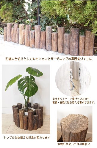 本物の木でつくられた、ぬくもりあふれる木のフェンス。丸太をアイアンで繋げているので直線にも、曲線にも形を自由に変えられます。プランターの周りに置いたり、花壇の仕切りにしてウッディな雰囲気づくりに♪ナチュラルでやさしい雰囲気が楽しめます♪お部屋やお庭を可愛くデコレーションしてアレンジを楽しんでくださいね。