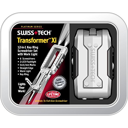 Swiss Tech Transformer Xi 12-in-1 screwdriver set with work light has 6 screwdrivers, bright white 2-LED flashlight, dual work lights, 1/4 inch rule markings, 5 millimeter marking and straight edge.