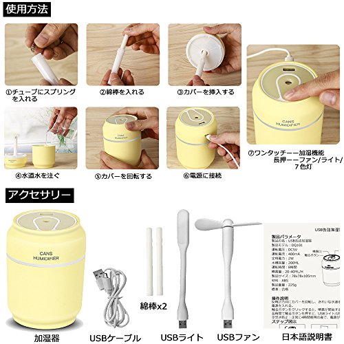 アクセサリー: USB缶詰加湿器X1 USBケーブルX1 綿棒X2 USBライトX1 USBファンX1 日本語説明書X1