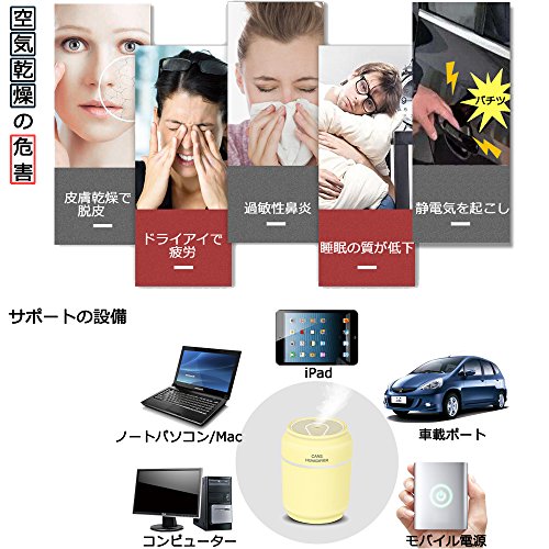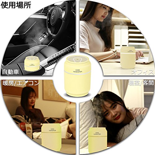 ミニ ポータブル 卓上 加湿器 (LEDライト & USBファン付き), Sysmarts® 超音波式 コンパクト 車載用 間接照明 空気清浄器 (ムード ランプ & 空焚き防止機能搭載)— 黄色 イエロー