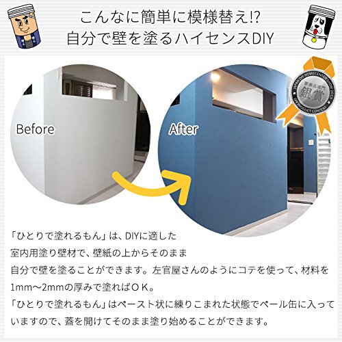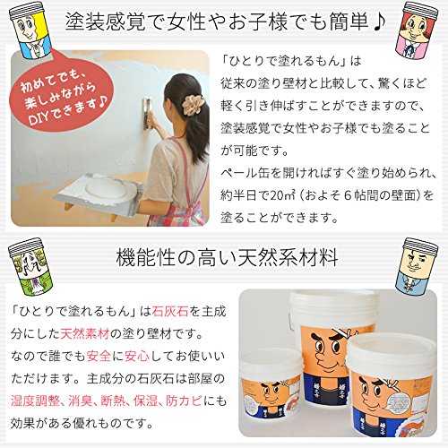 「ひとりで塗れるもん」は、DIYに適した室内用塗り壁材で、壁紙の上からそのまま自分で壁を塗ることができます。左官屋さんのようにコテを使って、材料を1mm~2mmの厚みで塗ればOK。「ひとりで塗れるもん」はペースト状に練りこまれた状態でペール缶に入っていますので、蓋を開けてそのまま塗り始めることができます。「ひとりで塗れるもん」は従来の塗り壁材と比較して、驚くほど軽く引き伸ばすことができますので、塗装感覚で女性やお子様でも塗ることが可能です。ペール缶を開ければすぐ塗り始められ、約半日で20㎡(およそ6帖間の壁面)を塗ることができます。