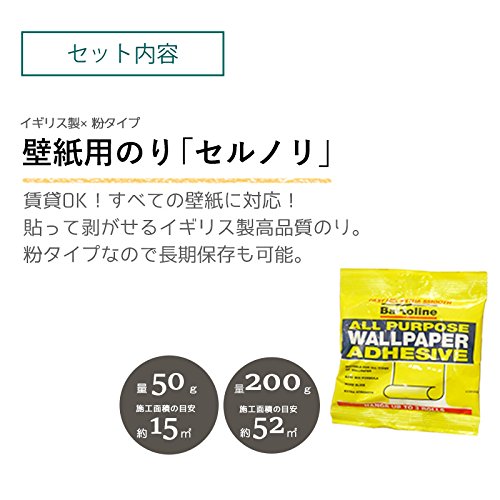 - 【セルノリの特徴】壁紙の上からでも貼って剥がせて賃貸OK!水でまぜるだけ、プロも使うイギリス製本格糊です。(表面に汚れ防止のフッ素コートがしてある壁紙など一部の壁紙にはうまく貼れなかったり剥がれてくる可能性があります )