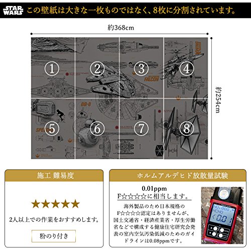 - 【壁紙について】■素材:紙 ■施工難易度:★★★★★ ■付属品:壁紙の貼り方[作業説明書]、粉のり ■壁紙サイズ:368×254cm(8枚に分かれています)