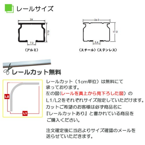 - レールカットは無料で承ります(1辺あたり45cm以上91cmまで1cm単位)。注文確定後に当店からお送りするメールにご希望のサイズをご入力いただきご返信ください。※ご希望のサイズをお知らせいただくまで、ご注文は一旦保留となります。また、ご注文日より3営業日以内にご返信くださいますようお願いします。