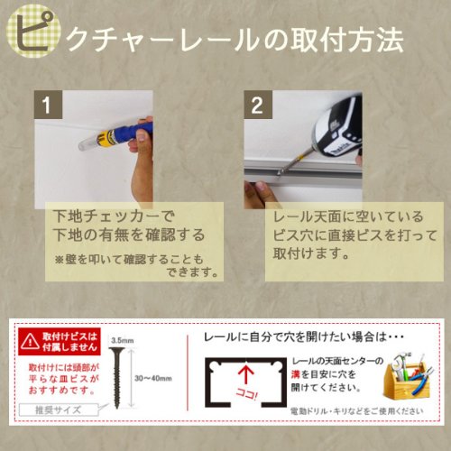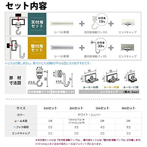 - 付属品:レール、移動フック、エンドキャップ ※151cm以上はジョイント式になります。※ビスは付属しませんのでご用意いただく必要があります。