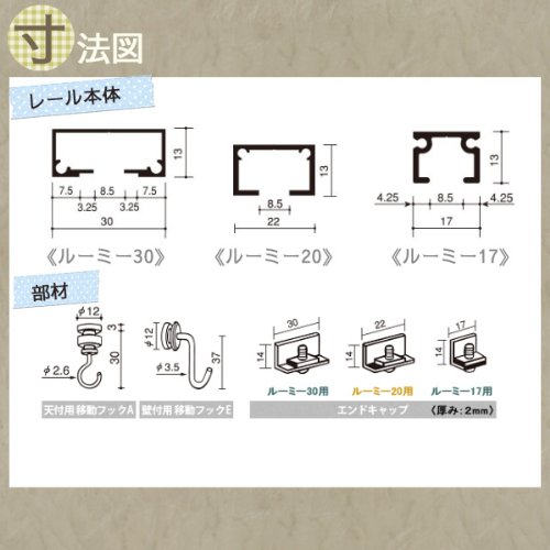 - 耐荷重の異なる3つのレールからお選びいただけます。【ルーミー17】耐荷重20kg レールが細く、スタイリッシュなモデル【ルーミー20】耐荷重30kg 3サイズで最も強度が強いアッパーモデル【ルーミー30】耐荷重15kg 幅広なデザインで、天井ともなじみやすいスタンダードモデル