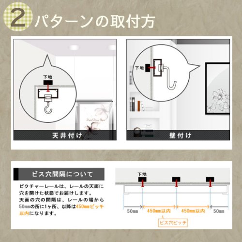 クロス(壁紙)の上から設置できる、『後付けタイプ』のピクチャーレールで、あらゆるインテリアになじむシンプルなデザインが魅力。