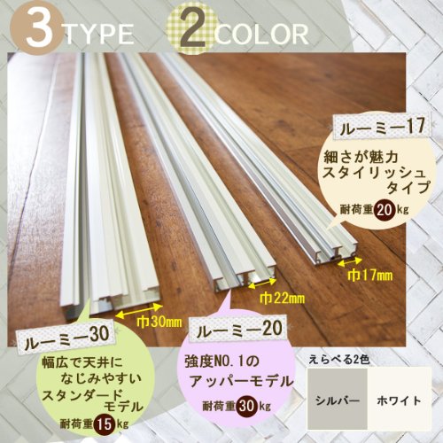 - 耐荷重の異なる3つのレールからお選びいただけます。【ルーミー17】耐荷重20kg レールが細く、スタイリッシュなモデル【ルーミー20】耐荷重30kg 3サイズで最も強度が強いアッパーモデル【ルーミー30】耐荷重15kg 幅広なデザインで、天井ともなじみやすいスタンダードモデル