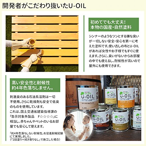 カラーバリエーション豊富で、布とこのU-OILがあればDIYを楽しめます。またシンナーのような嫌な臭いが一切しないので、女性は勿論、お子様も安心してご利用頂ける「本物の国産自然塗料」です。