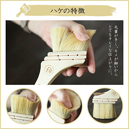 - ■特徴:塗面がキメ細かく、刷毛目の出ない最高級羊毛刷毛です。毛先と毛腰に技術を集結させた職人さんが使う建築用刷毛のベストセラー。耐久性にも優れており、繰り返して使うことでより馴染みが良く使いやすくなります。また、きめ細かい質の良い毛を密にたくさん使っているので、含みも良く仕上りが良い最高級なハケです。