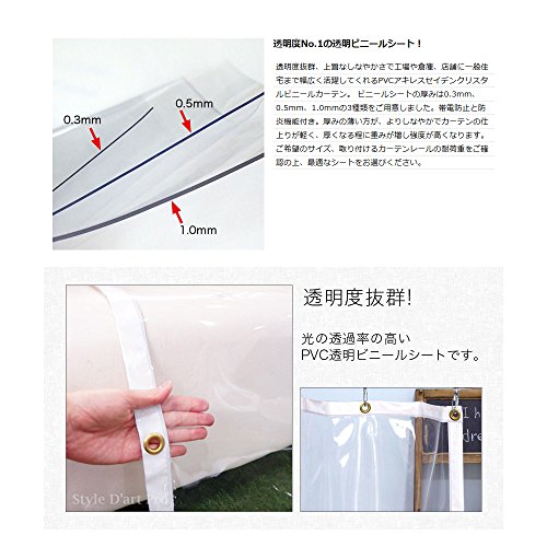 透明度抜群、上質なしなやかさで工場や倉庫、店舗に一般住宅まで幅広く活躍してくれるPVCアキレスセイデンクリスタルビニールカーテン。 ビニールシートの厚みは0.3mm、0.5mm、1.0mmの3種類をご用意しました。帯電防止と防炎機能付き。厚みの薄い方が、よりしなやかでカーテンの仕上りが軽く、厚くなる程に重みが増し強度が高くなります。ご希望のサイズ、取り付けるカーテンレールの耐荷重をご確認の上、最適なシートをお選びください。