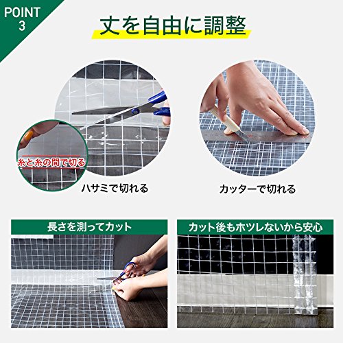- ハサミで裾の長さをカットできる既製サイズのビニールカーテン。透明度バツグンの糸入り透明シートです。