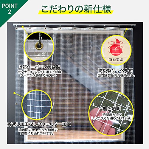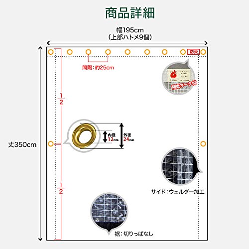 - ■仕様:縦方向:折返し加工補強なし、横方向:上部折返しターポリン巻縫製、下部:カットのみ、防炎製品ラベル付