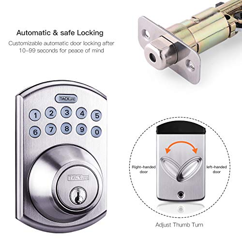 Tacklife EKLP1A 電子キーパッドデッドボルト ワンタッチ電動ロック&シングルシリンダー フロントドア、サイド&バックドア用、サテンニッケル