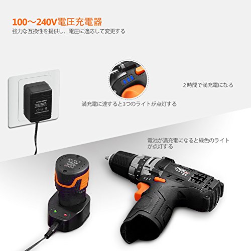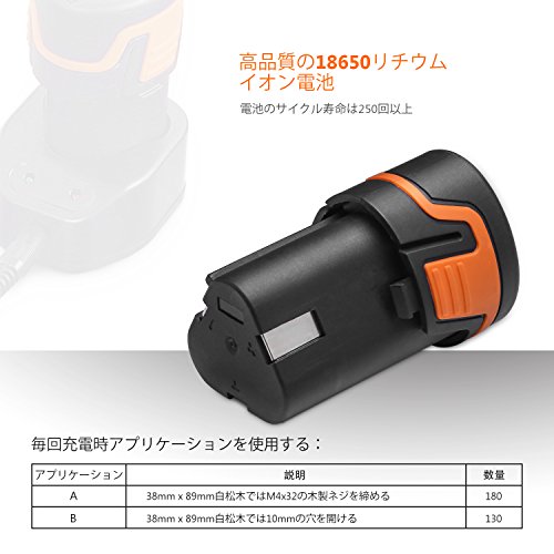 - ▲充電式:コードレスで、高容量12V、2000mAhリチウムイオン電池が付き、ドリルを持ち運び、速い装填および長持ちに便利で使いやすくて、屋外でも気にせず長時間作業ができます。