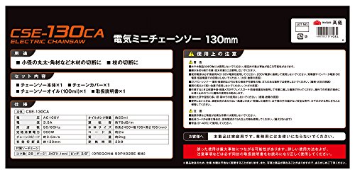 ●コンパクトで軽量。女性でも扱いやすい軽さ●工具不要でソーチェーンの調整・交換が簡単●チェーンオイル自動注油式●小径の丸太・角材など木材の切断●枝の切断●電圧:AC100V●周波数50/60Hz●電流:3.5A●定格消費電力:300W●チェーンスピード:約3.5m/s●有効切断長:約130mm●オイルタンク容量:約50ml●本体サイズ:約長さ400×幅195×高さ195mm●運転音:約78dB●コード長:約2m●質量:約2kg●定格時間:30分 <付属ソーチェーン>●コマ数:28●ゲージ:0.43″(1.1mm)●ピッチ:3/8″(OREGON社90PX-028E相当)●サイズ:幅450×高さ210×奥行205mm●2800g●付属品・セット内容:本体・チェーンカバー・チェーンソーオイル(約100ml)