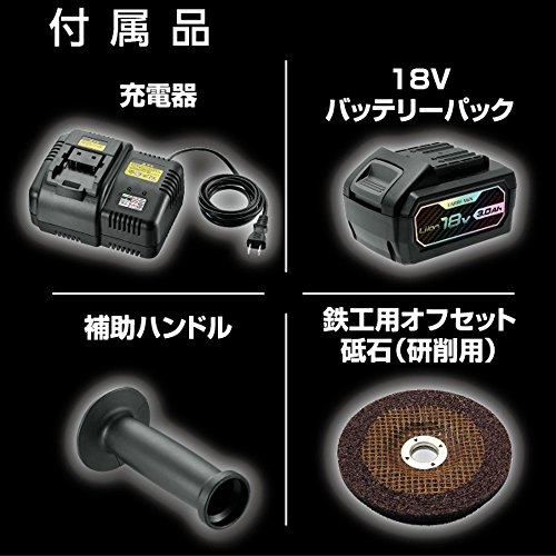 - 質量:約2.2kg(鉄工用オフセット砥石・補助ハンドル・バッテリーパック含む)