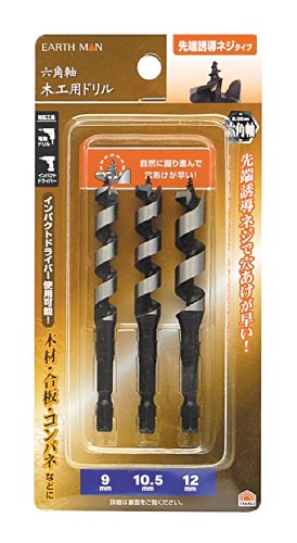 高儀 EARTH MAN 木工用 ドリル 六角軸 先端誘導ネジタイプ 9・10.5・12mm 3本組 6個入