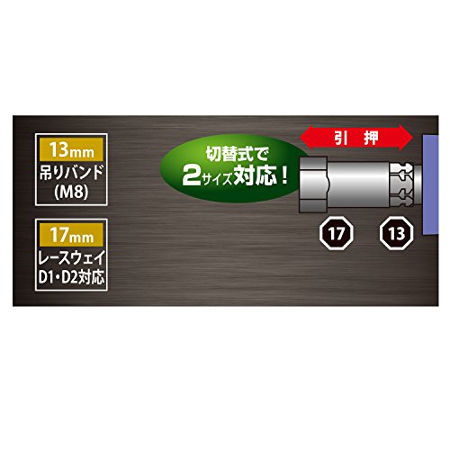 ●ボルトの長さを気にしないヘッド貫通タイプ●腰袋にすっぽり納まるショートタイプ●セーフティーコード取付用リング付●切替式で2サイズ対応●特許商品●13mm:吊りバンド(M8)●17mm:レースウェイD1・D2対応●6pt面接触型(Surface Drive)●【材質】●ヘッド部:炭素鋼(S45C)●パイプ:スチール●ソケット:Cr-V●グリップ:TPR●落下防止金具:炭素鋼(1008)●【サイズ】●全長:190mm●重量:420g●ソケット部長さ:17mm…55mm・13mm…47mm●サイズ:幅103×高さ255×奥行28mm●423g