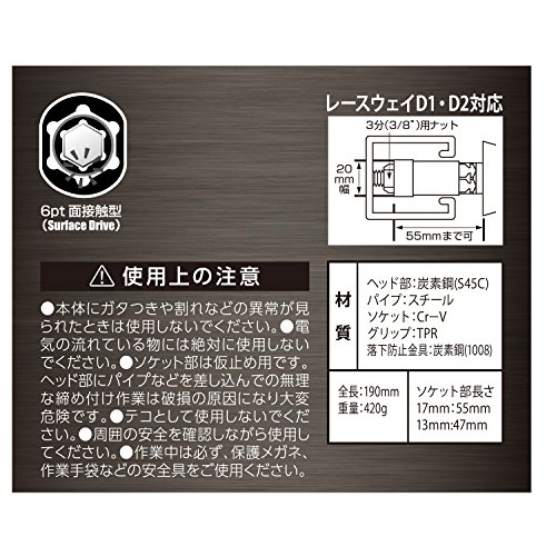 - 材質:ヘッド部 炭素鋼(S45C)、パイプ スチール、ソケット Cr-V、グリップ TPR、落下防止金具 炭素鋼(1008)