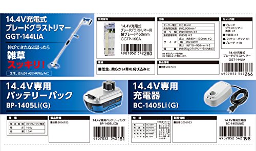 ●絶妙パワー14.4V作業とてもはかどる●充電式コードレス使用場所を選ばず自由自在●コンパクト&軽量疲れにくく女性・お年寄りに優しい●リチウムイオン電池継ぎ足し充電ができ効率UP●2倍使えて経済的!両刃樹脂ブレード10枚付●伸縮ポール好みの長さに調整できます全長約860~1060mm●ハンドグリップ付好みの位置に移動できしっかり保持●滑り止めグリップ握りやすく手に馴染む●芝生、柔らかい草の刈り込みに ※枝打ち作業・壁や岩などに生えている草刈作業などには絶対に使用しないでください。また、ススキなどの硬い草には使用できません。●<本体(GGT-144LiA)>●モーター電圧:DC14.4V●無負荷回転数:約12,000min-1●刈込幅:約φ160mm●連続使用時間:約25分●サイズ:長さ約880~1130mm 幅約230mm 高さ約710~920mm●質量:約1.05kg(バッテリーパック含む)<充電器(BC-1405Li(G)>●電圧:AC100V●周波数:50/60Hz●充電時間:約1時間●コード長:約1.8m <バッテリーパック(BP-1405...