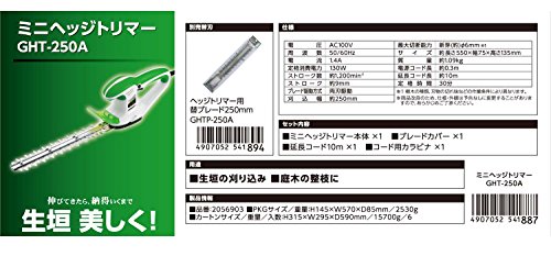 ●3つの効き目●AC100V家庭用電源使用:充電などの準備なしですぐに使える。●コード用カラビナ付:作業時のコード切断を防ぐ。●延長コード10m付:作業にとても助かる。●両刃駆動ブレード:両刃駆動だから刈込効率が良い。●ハンドガード付:ブレードから手を守り、安全に作業できます。●滑り止めグリップ付:滑りにくく、握りやすく手に馴染むグリップ●コード用カラビナ付:コードのたるみによるコード切断を防ぎ、安全に作業できます。●生垣の刈り込み●庭木の整枝に●電圧:AC100V●周波数:50/60Hz●電流:1.4A●定格消費電力:130W●ストローク数:約1,200min●ストローク:約9mm●ブレード駆動方式:両刃駆動●刈込幅:約250mm●最大切断能力:新芽 約φ6mm●サイズ:約長さ550×幅75×高さ135mm●質量:約1.09kg●電源コード長:約0.3m●延長コード長:約10m●定格時間:30分●サイズ:幅570×高さ145×奥行85mm●2530g●付属品・セット内容:本体×1・ブレードカバー×1・ハンドガード×1・延長コード10...