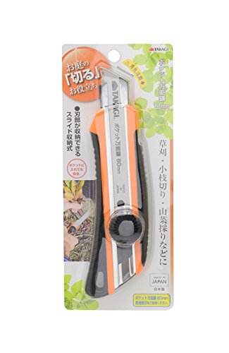 ●刃部が収納できるスライド収納式●ポケットに入れても安全●日本製●草刈・小枝切り・山菜採りなどに●刃材質:SK85●刃厚:0.6mm●表面処理:クリアコート●刃渡り:80mm●サイズ:幅80×高さ190×奥行32mm●117g
