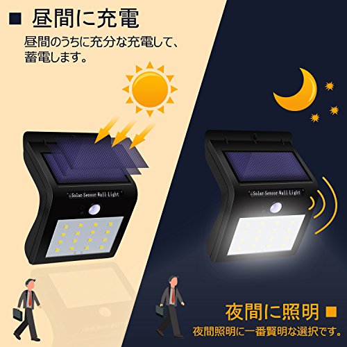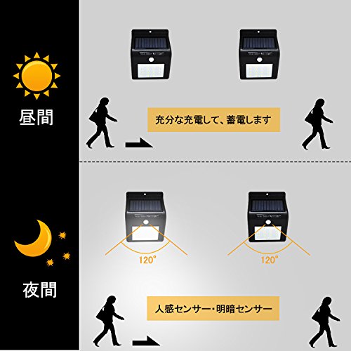 - 【超省エネ・超高輝度】お金を払う必要がありません。直接によく日が当たて射し込む場所に取り付けて、充電した後で、安心して使用してください。環境にやさしい商品です。庭先、玄関、台所、勝手口、車庫、軒先、通路、ベランダ、屋外の階段、駐車場、パーク、ポスト、縁側、ガレージ、パルコニー、遊び場、庭など、いろいろの場所に合って、完璧な選択です。