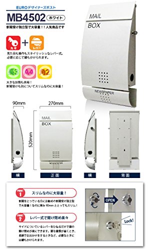 EUROデザイナーズポスト MB4502 レバータイプ鍵付き ホワイト 新聞受け有 MB4502-KL-white 55